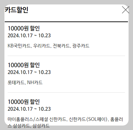- 할인 카드: 신한, 삼성, 롯데, KB국민, 현대, NH농협 등 주요 카드사