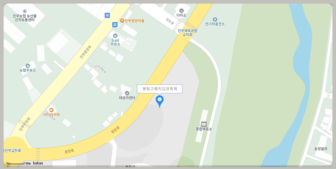 - 수도권: 경부고속도로 신갈 JC 또는 중부고속도로 호법 JC에서 영동고속도로 강릉 방면으로 진입하여 진부 TG에서 나옵니다. TG에서 행사장까지는 약 3분 거리입니다.