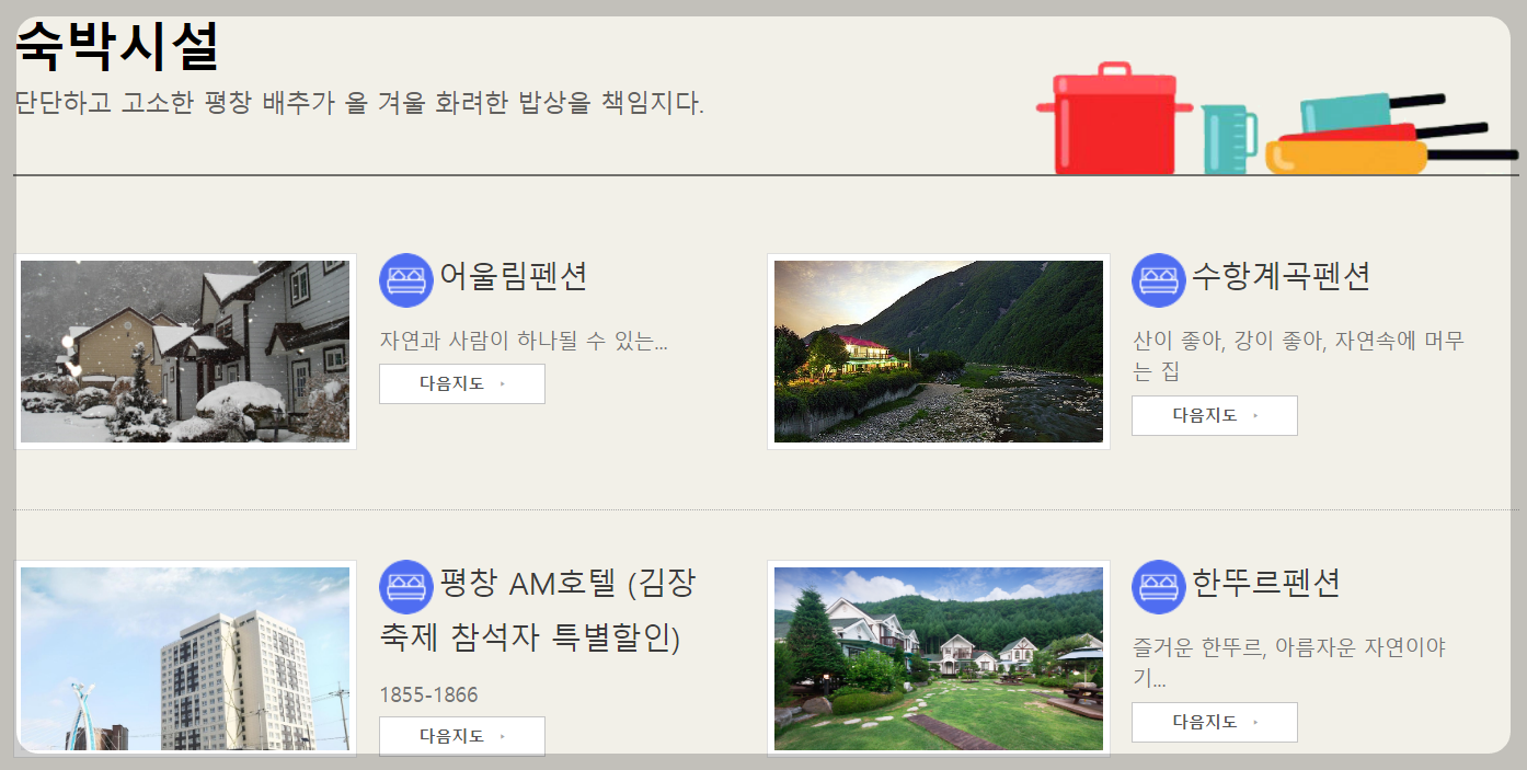 평창 고랭지 김장축제에서의 체험 후 이곳 주변의 다양한 맛집과 숙소에서 편안한 여행을 즐기며 평창의 겨울 정취를 만끽해 보세요!