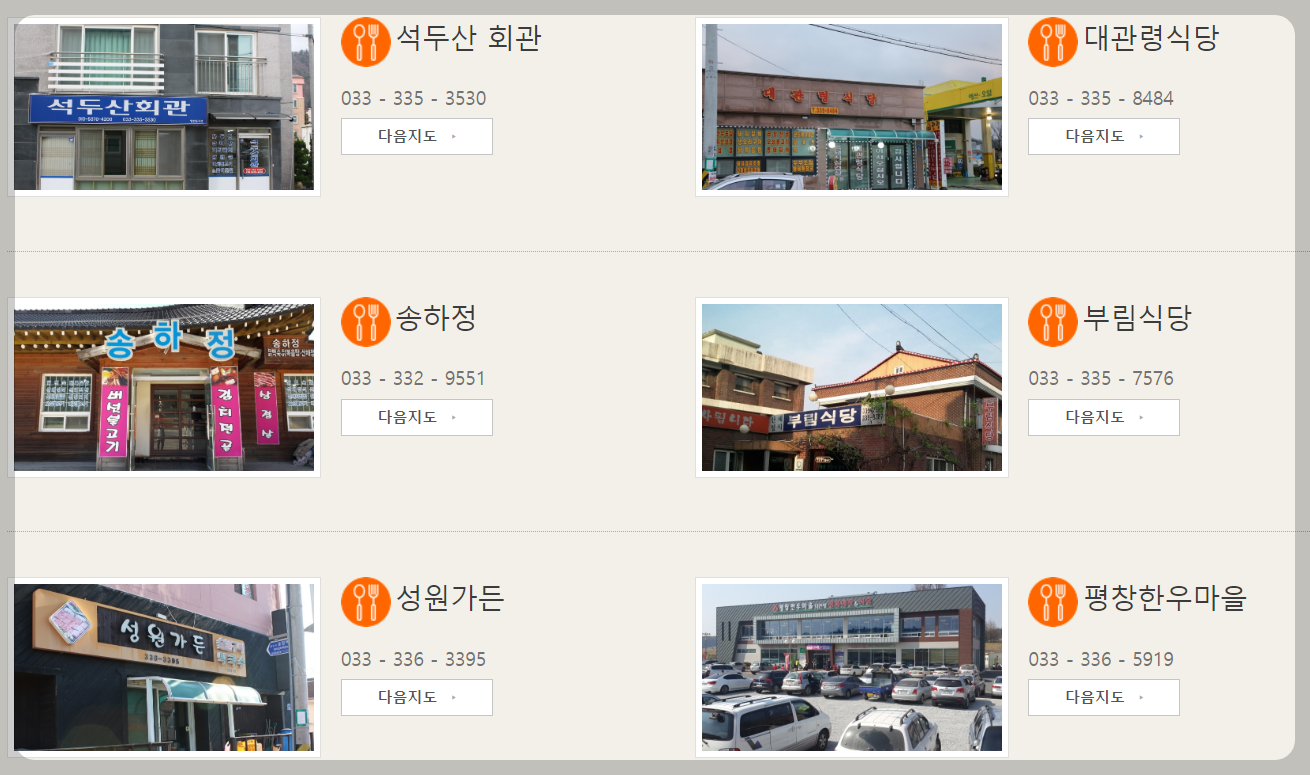 평창 고랭지 김장축제를 신나게 즐기고 나면 출출해질 텐데요. 바로 아래에 가까운 맛집 명소들을 정리해 두었으니, 단체로 오신 분들은 예약 후 방문하시면 기다림 없이 편하게 식사하실 수 있습니다. 참고해 주세요!