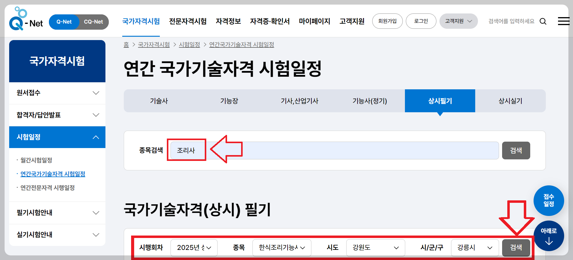 2. [국가기술자격] → [시험일정] → [종목 검색]에서 ‘한식조리사’를 선택합니다.