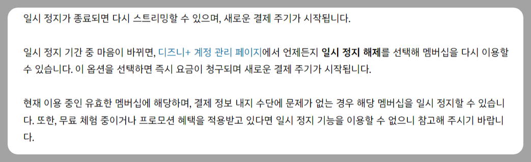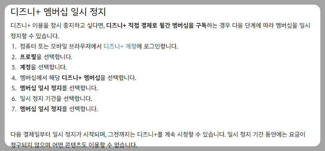 디즈니플러스의 결제 관리에는 자동 결제 해지 외에도 일시 정지 및 계정 탈퇴 등의 옵션이 있습니다. 각각의 차이점을 간단히 정리해 보겠습니다.