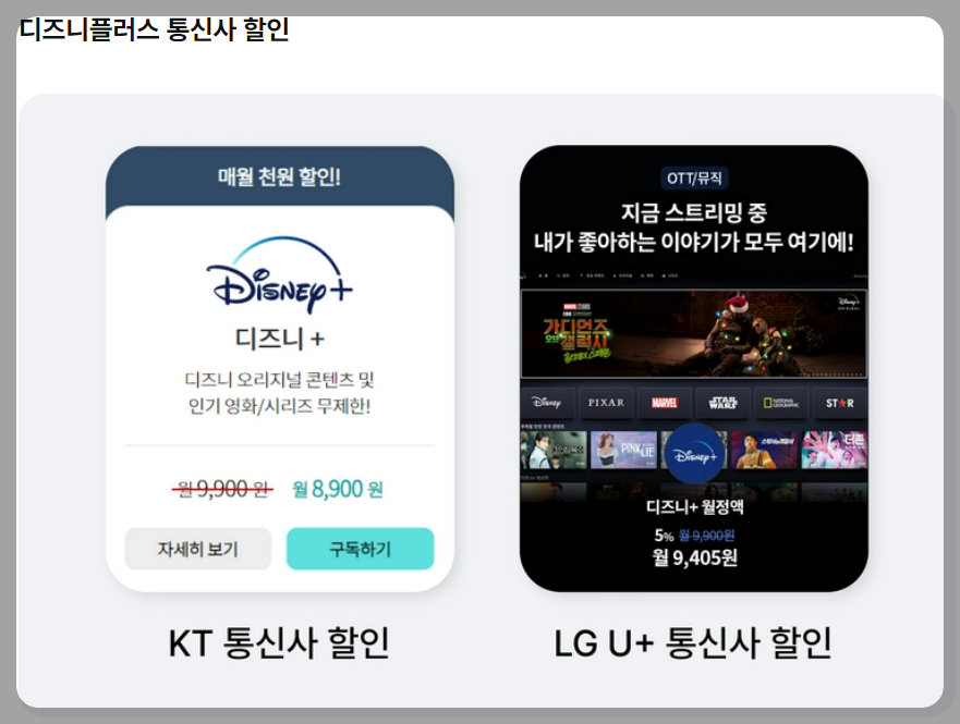 | KT | 디즈니+ 월 9,900원 → 8,900원 (매월 1,000원 할인) |