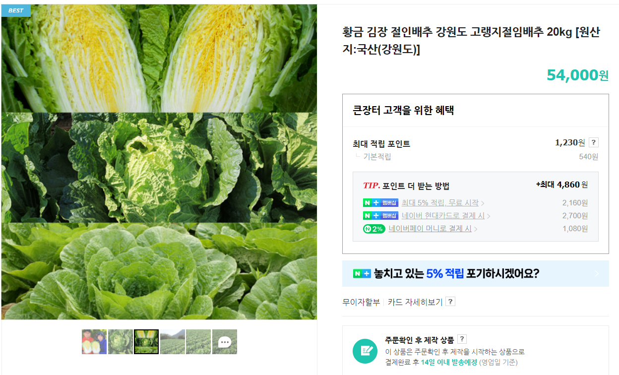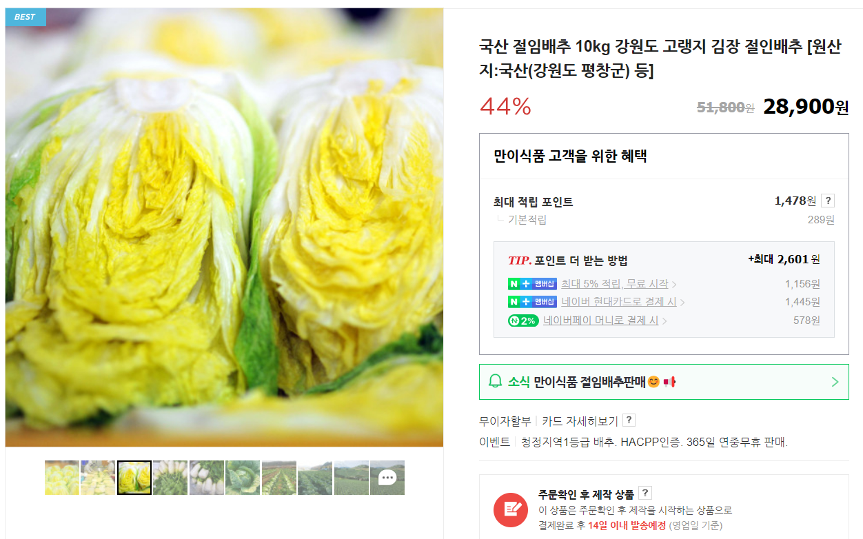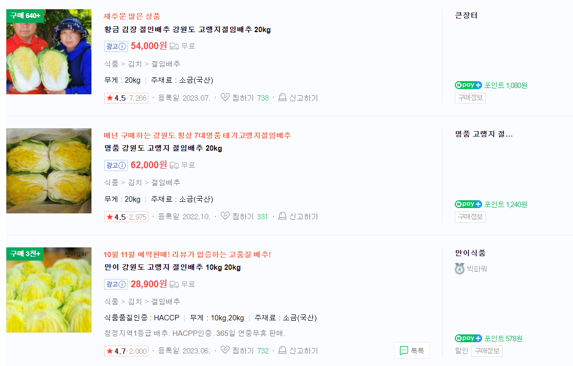"황금 김장 고랭지 절임 배추" 리뷰 7000건이 넘는 네이버 구매율 1위