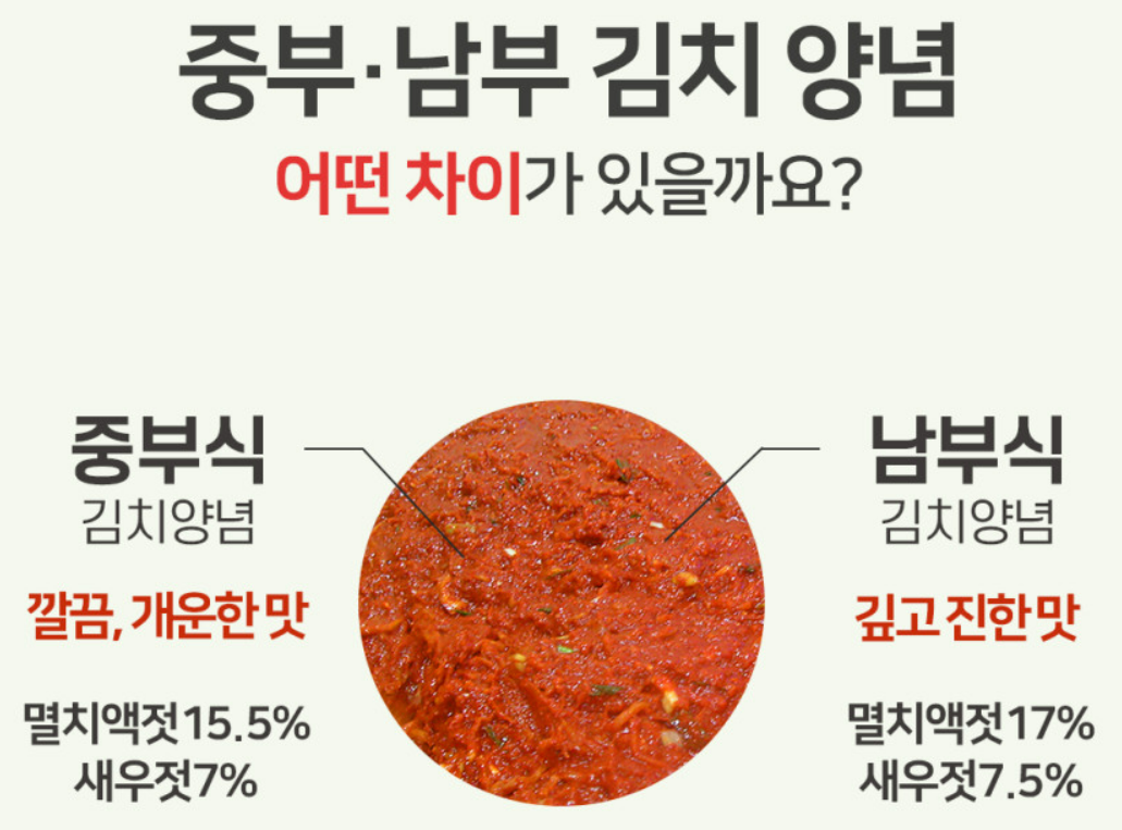 젓갈의 함량의 차이로 중부식, 남부식으로 나뉘며, 개인의 선호도에 따라 김치양념 고를 수 있는 장점이 있습니다.