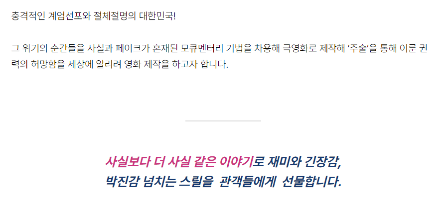 이 극영화는 픽션(Fiction)과 사실(Fact)이 혼재된 모큐멘터리 기법으로 제작되어, 관객들에게 박진감 넘치는 스릴과 충격적인 스토리를 선사할 예정입니다. 2025년 상반기 개봉을 목표로 한 본 프로젝트는 ‘주술’이라는 비현실적인 요소와 정치적 음모가 뒤얽힌 스토리를 통해 권력의 허망함과 몰락의 끝을 조명합니다.