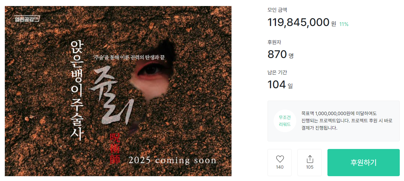 최근 탄핵 정국과 맞물려 큰 화제를 모으고 있는 영화 펀딩! 열린공감 TV에서 기획한 ‘앉은뱅이 주술사’는 김건희 여사의 '줄리 논란', 주술, 권력, 그리고 몰락을 독창적인 소재로 삼아 제작됩니다.