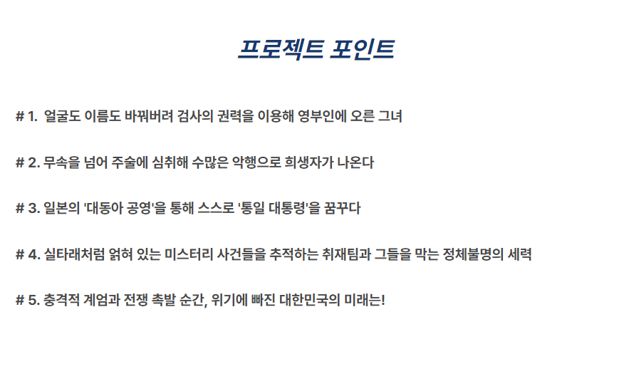 그녀의 궁극적인 꿈은 ‘통일 대통령’이 되어 일본의 ‘대동아 공영’이라는 야망을 실현하는 것입니다. 하지만 그 과정에서 계엄령을 선포하고, 한반도를 전쟁 위기로 몰아가며 대한민국의 운명을 절체절명의 위기로 몰아넣습니다.