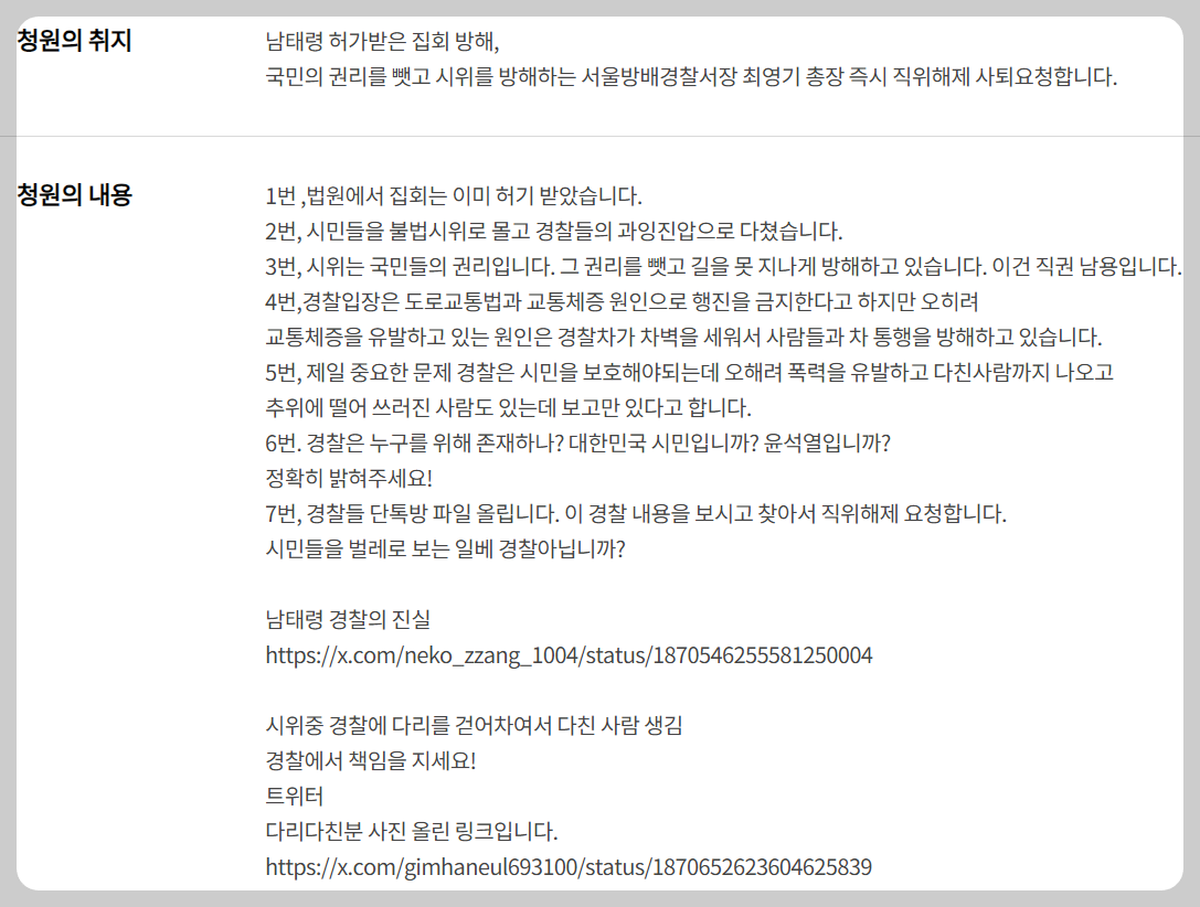 이번에 올라온 남태령 시위 과잉진압에 대한 청원은 다음과 같습니다.
