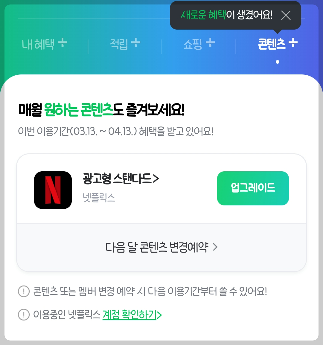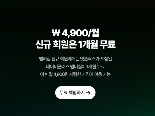넷플릭스 광고형 스탠다드를 월 4,900원에 이용할 수 있고, 신규 가입자는 첫 달 무료 체험이 가능해요. 거기에 무료배송, 적립 혜택까지 더해지니 기존 넷플릭스 이용자라면 네이버 멤버십을 활용해보는 것도 좋은 선택이랍니다.