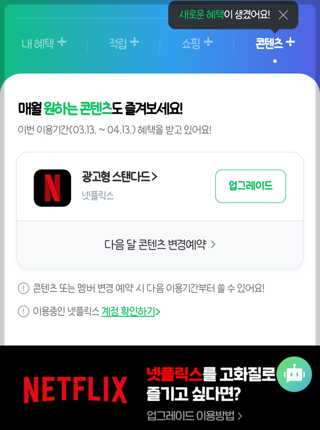 넷플릭스 광고형 스탠다드를 월 4,900원에 이용할 수 있고, 신규 가입자는 첫 달 무료 체험이 가능해요. 거기에 무료배송, 적립 혜택까지 더해지니 기존 넷플릭스 이용자라면 네이버 멤버십을 활용해보는 것도 좋은 선택이랍니다.