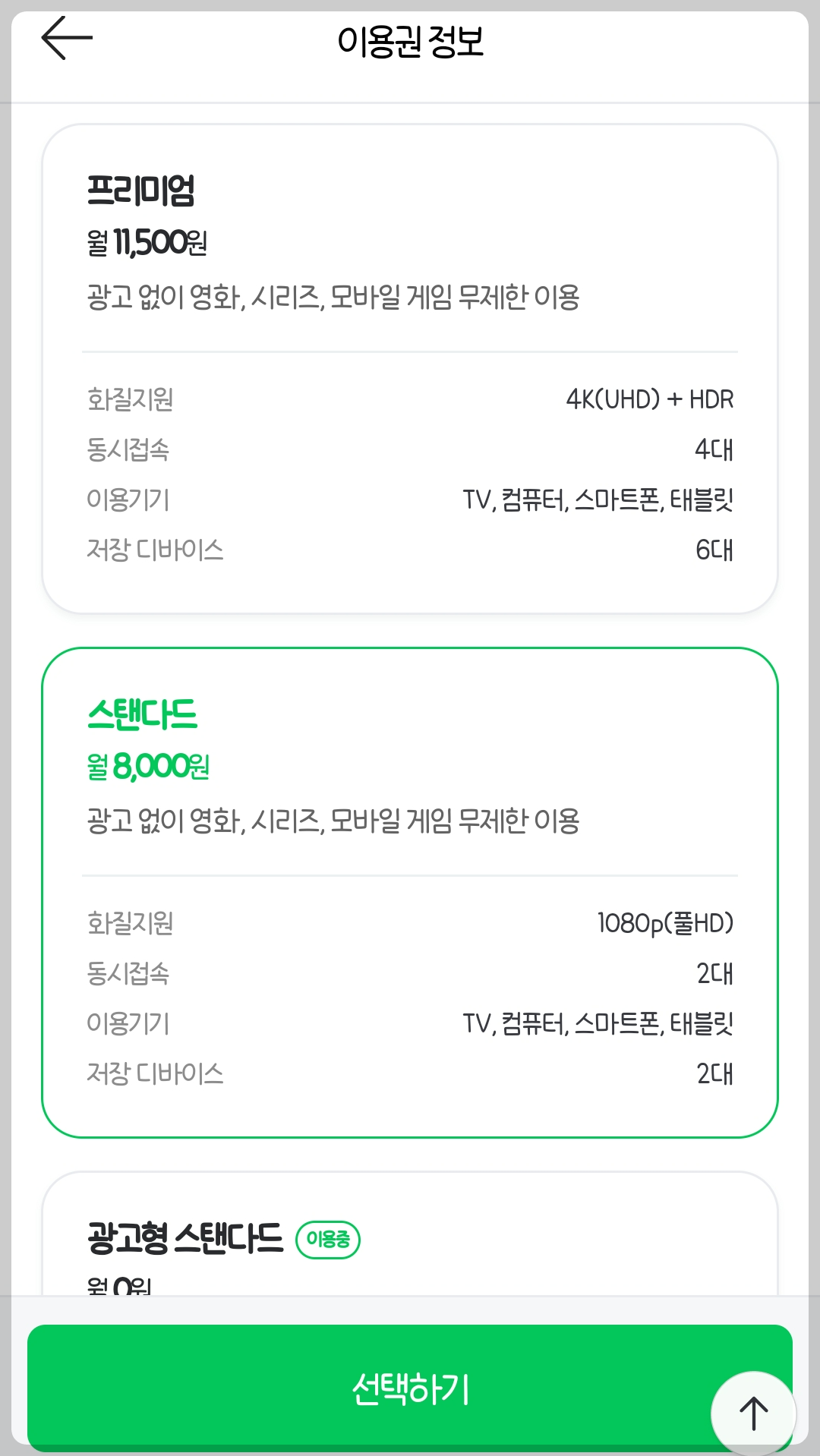 | 요금제 | 가격 | 화질 | 동시 접속 가능 인원 | 광고 여부 |