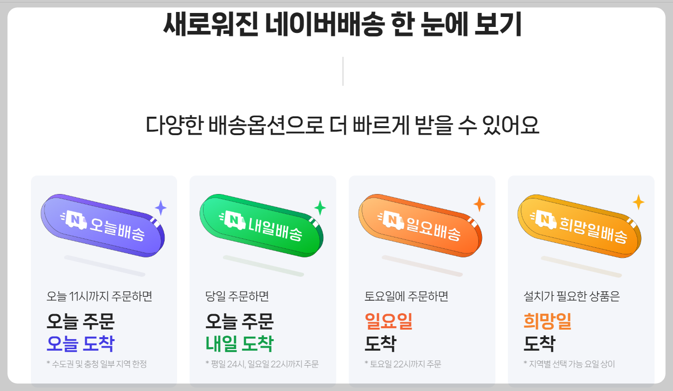 | 오늘배송 | 오전 11시 이전 | 당일 도착 (서울·수도권 일부) |