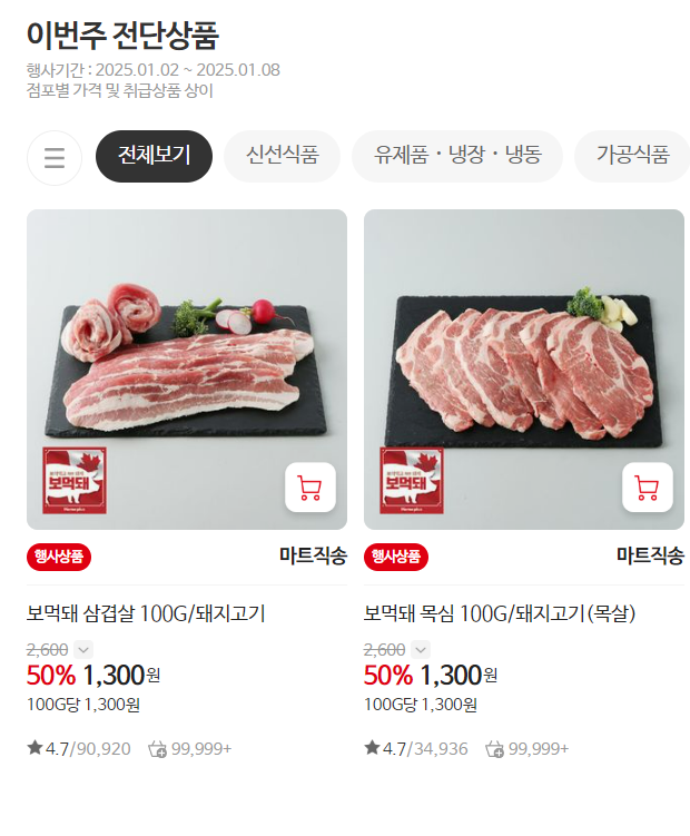 - 삼겹살/목심(100g): 행사카드 결제 시 1,300원