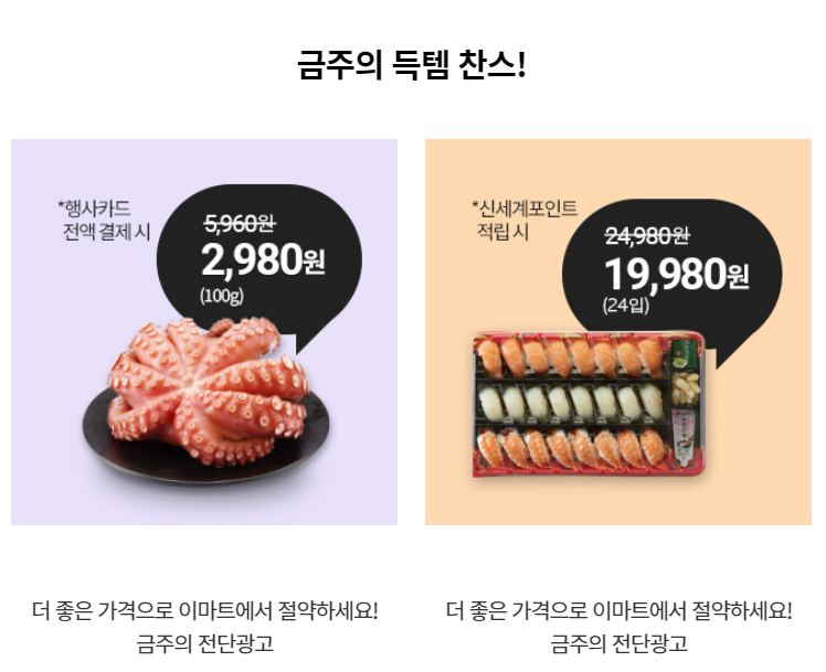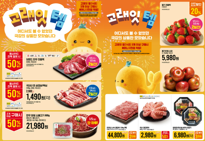- 신선식품 1+1 행사: 제철 야채와 과일 포함