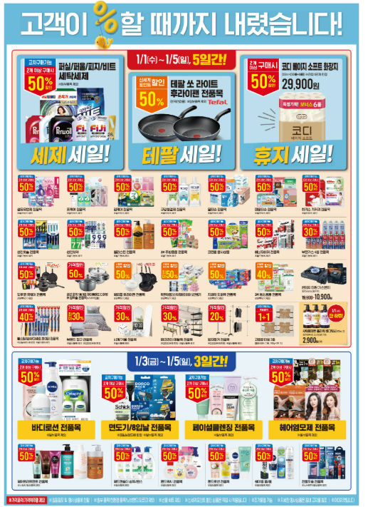 - 냉동 피자/핫도그: 2개 이상 구매 시 50% 할인