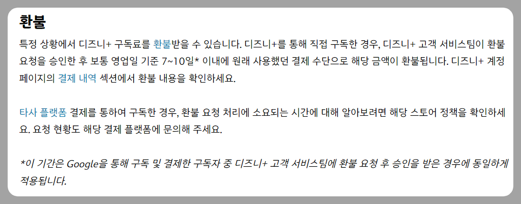 ✅ 디즈니 플러스를 통해 직접 구독한 경우, 특정상황에 따라 구독료 환불도 가능합니다. 고객 서비스팀이 환불 요청을 승인한 후 보통 영업일 기준 7~10일 이내에 원래 사용했던 결제 수단으로 해당금액이 환불됩니다. (위의 내용 참고)