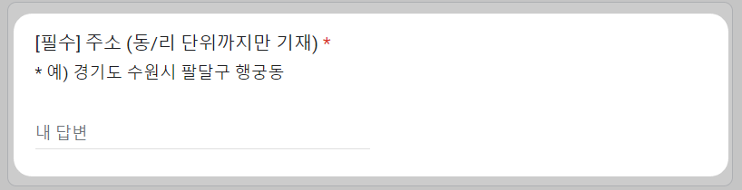 주소: 동/리 단위까지 작성 (예: 경기도 수원시 팔달구 행궁동).