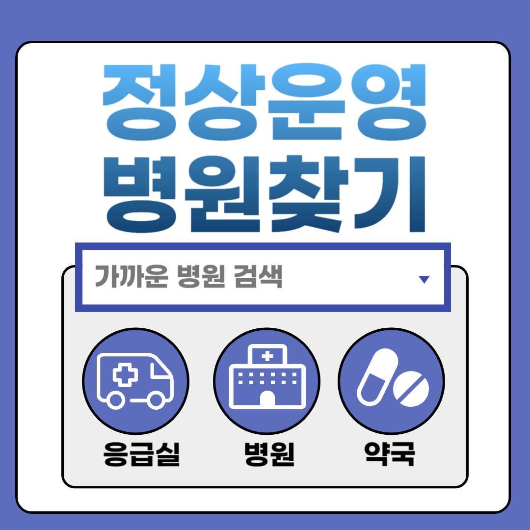 내가 자주가던 병원이 운영을 안하고 있을 수 있습니다. 아래에서 현재 정상운영하는 병원, 약국, 응급실을 즉시 찾을 수 있으니 참고해주세요!