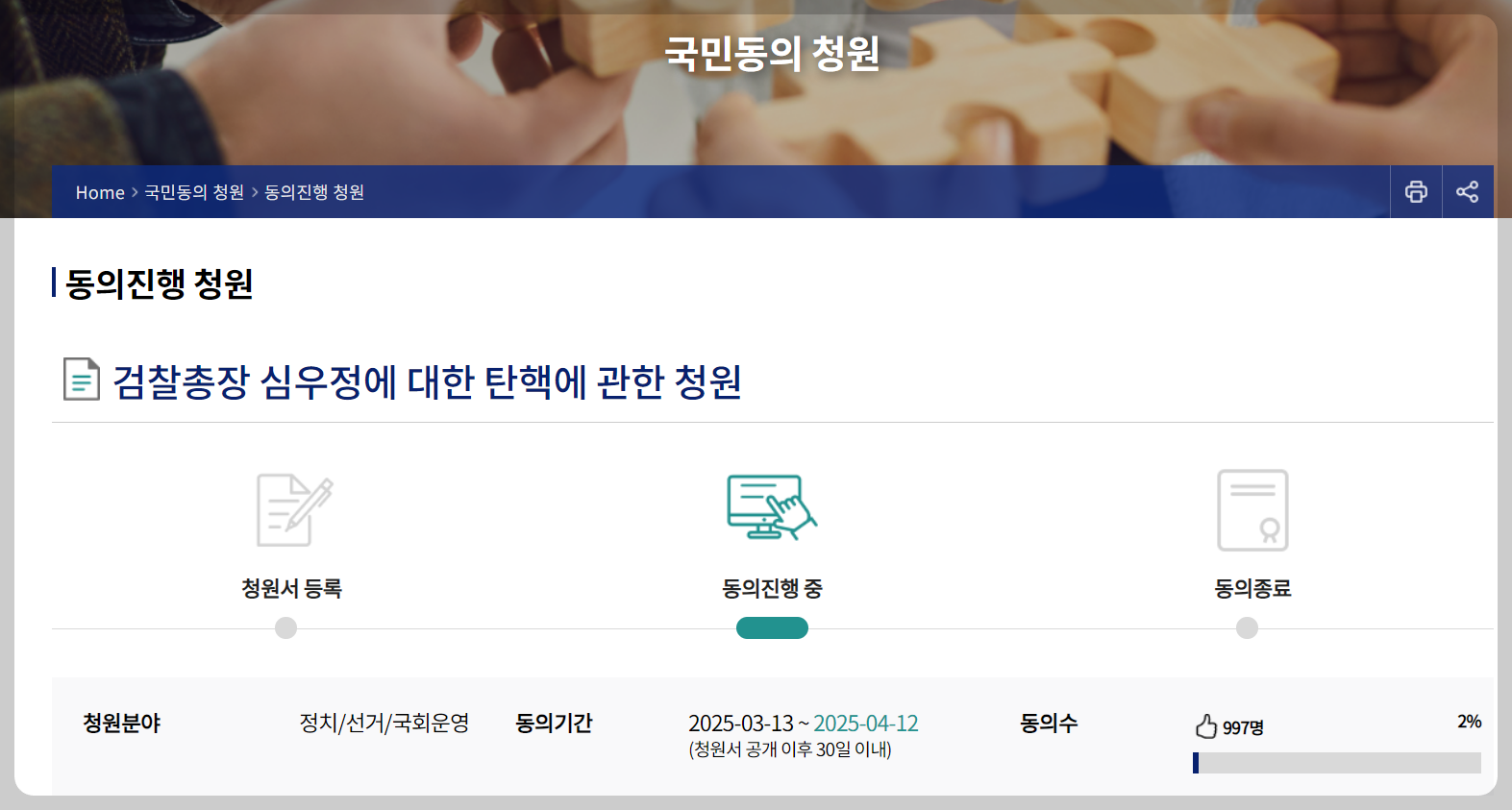 - 현재 동의자 수: 997명 (3월 16일 기준, 2% 달성)