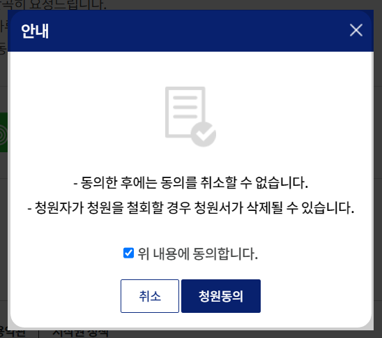 로그인 후, 청원 내용을 확인하고 ‘동의하기’를 선택하여 동의를 완료합니다.