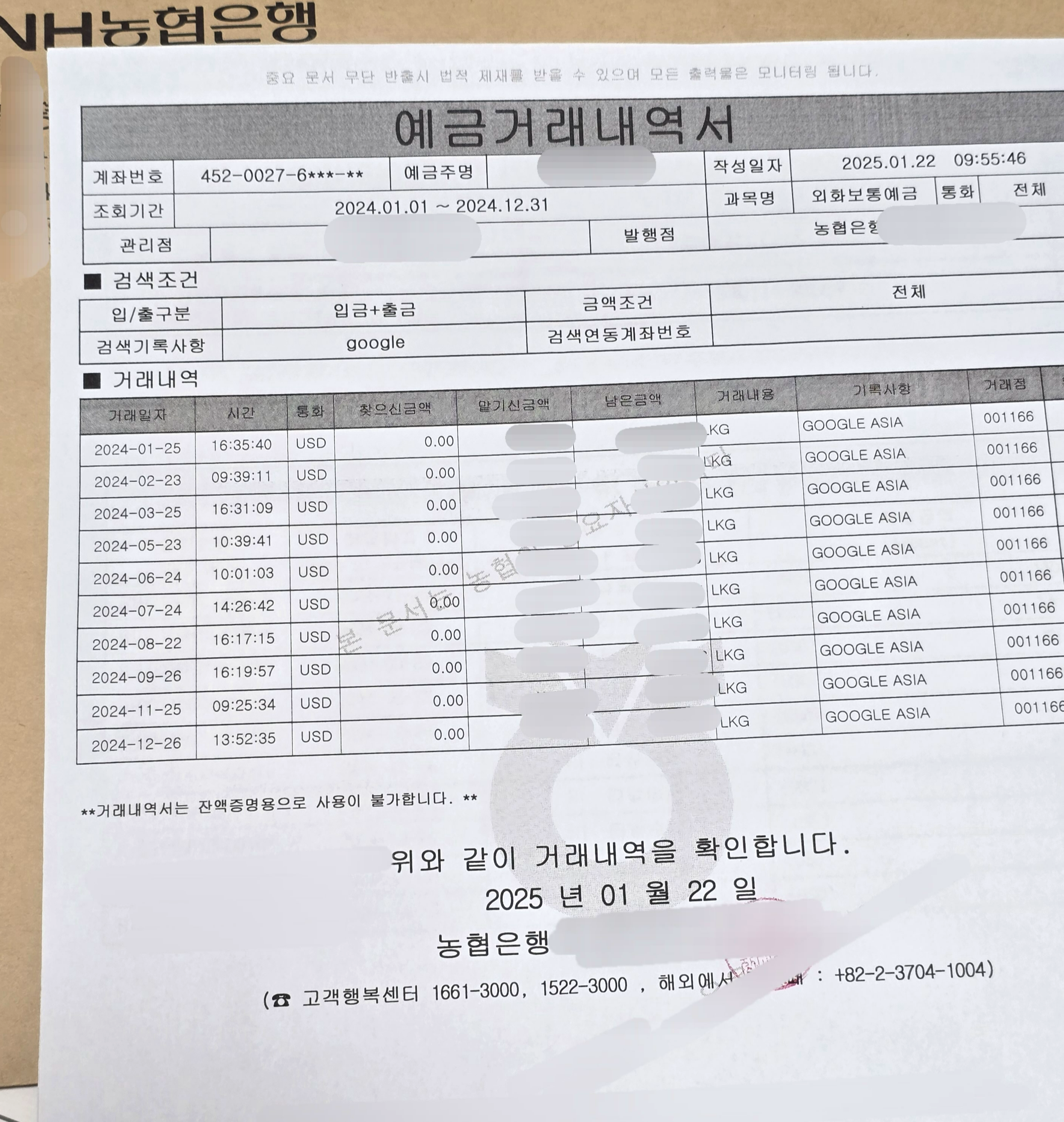 애드센스를 통해 외화 수익을 얻는 간이과세자라면, 부가가치세 신고와 종합소득세 신고를 위해 외국환매입증명서와 외화예금 거래명세조회서가 필수입니다. 저는 이번에 농협은행에서 두 서류를 발급받았는데, 발급 과정과 비용 면에서 매우 만족스러웠습니다.