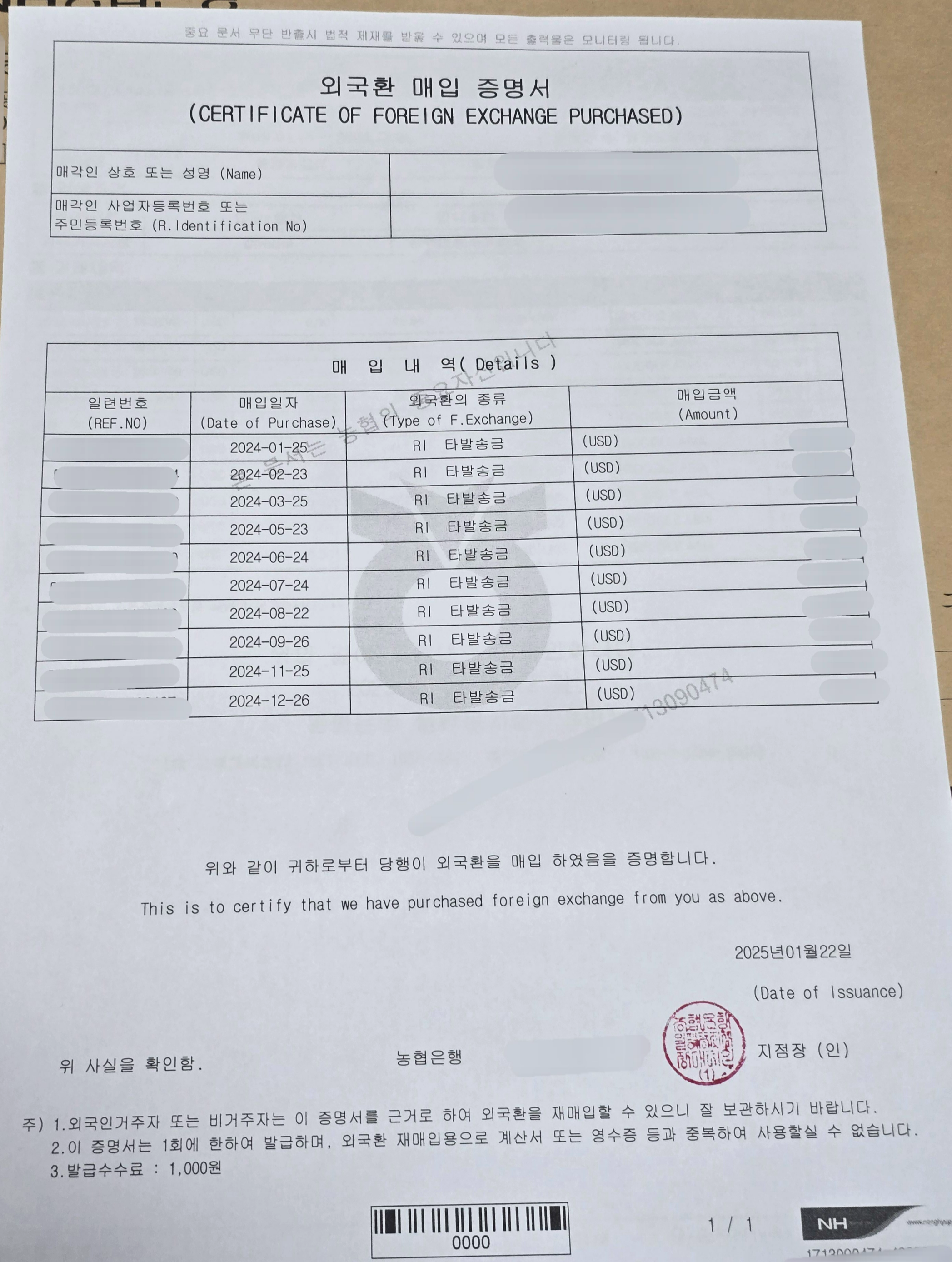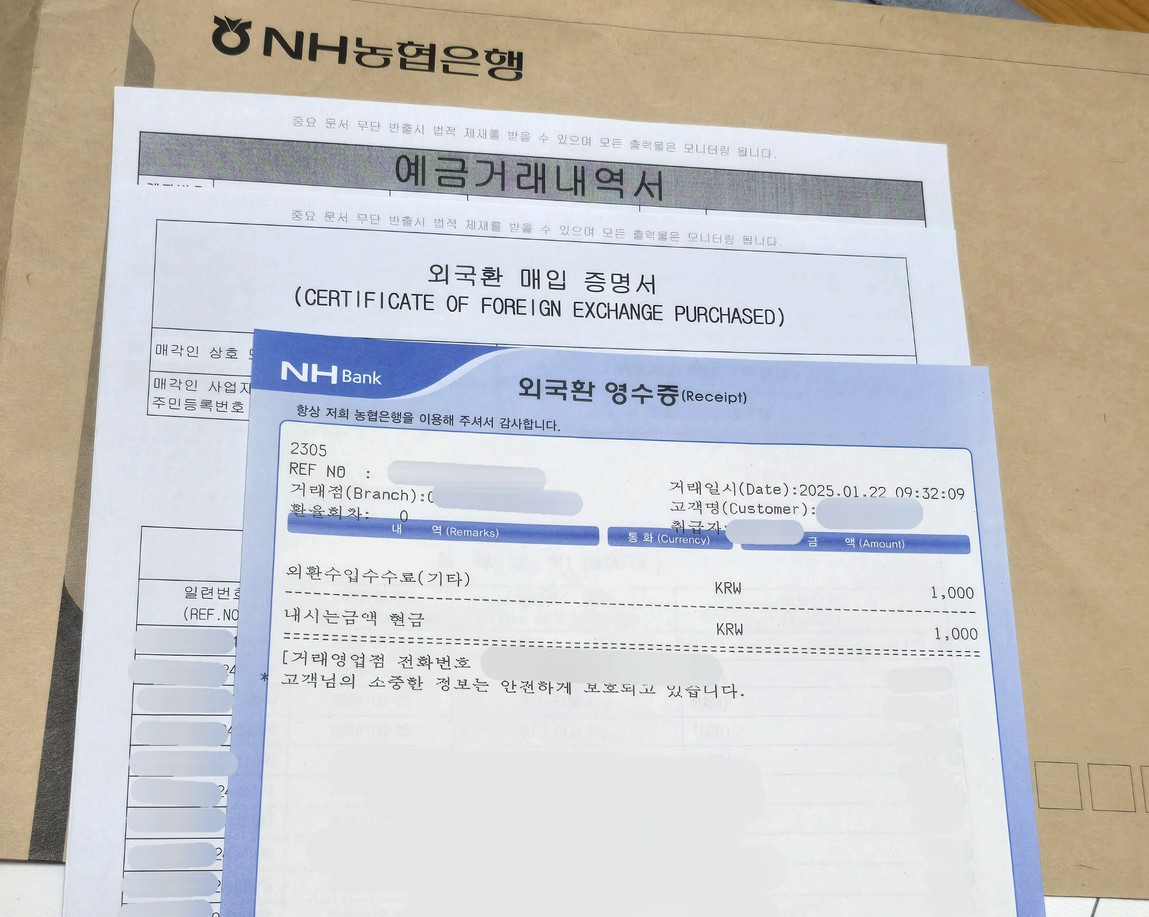 📌실제로 제가 직접 농협은행을 방문해보니, 은행원이 외국환매입증명서라는 용어에 익숙하지 않아 다른 직원분께 여쭤보는 경우가 많더군요. 위의 발급과정에서 서류의 목적을 잘 설명하시면 발급이 더 원활하니 참고하시길 바랍니다.