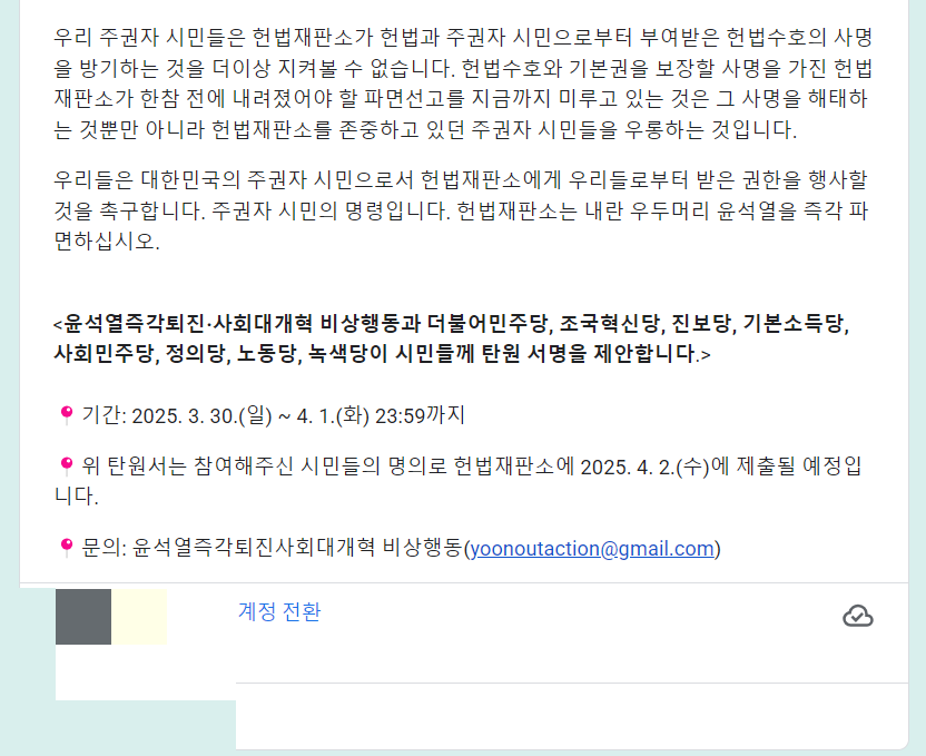 👉 윤석열 탄핵 서명 사이트 바로가기📆 마감: 2025. 4. 1(화) 밤 11:59까지