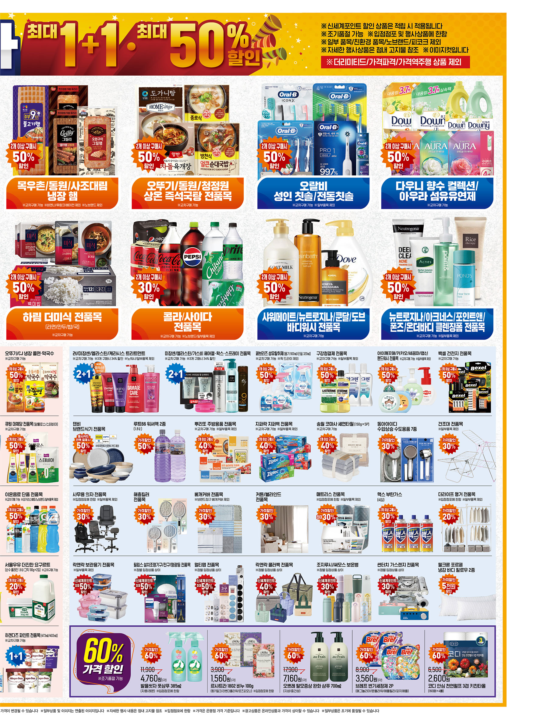 CJ 군만두, 포도씨유, 포스트 시리얼 등 다양한 생활용품도 2개 이상 구매 시 최대 50% 할인됩니다. 하겐다즈 파인트 아이스크림은 1+1, 락앤락 프라이팬/냄비 전품목은 50% 할인됩니다.