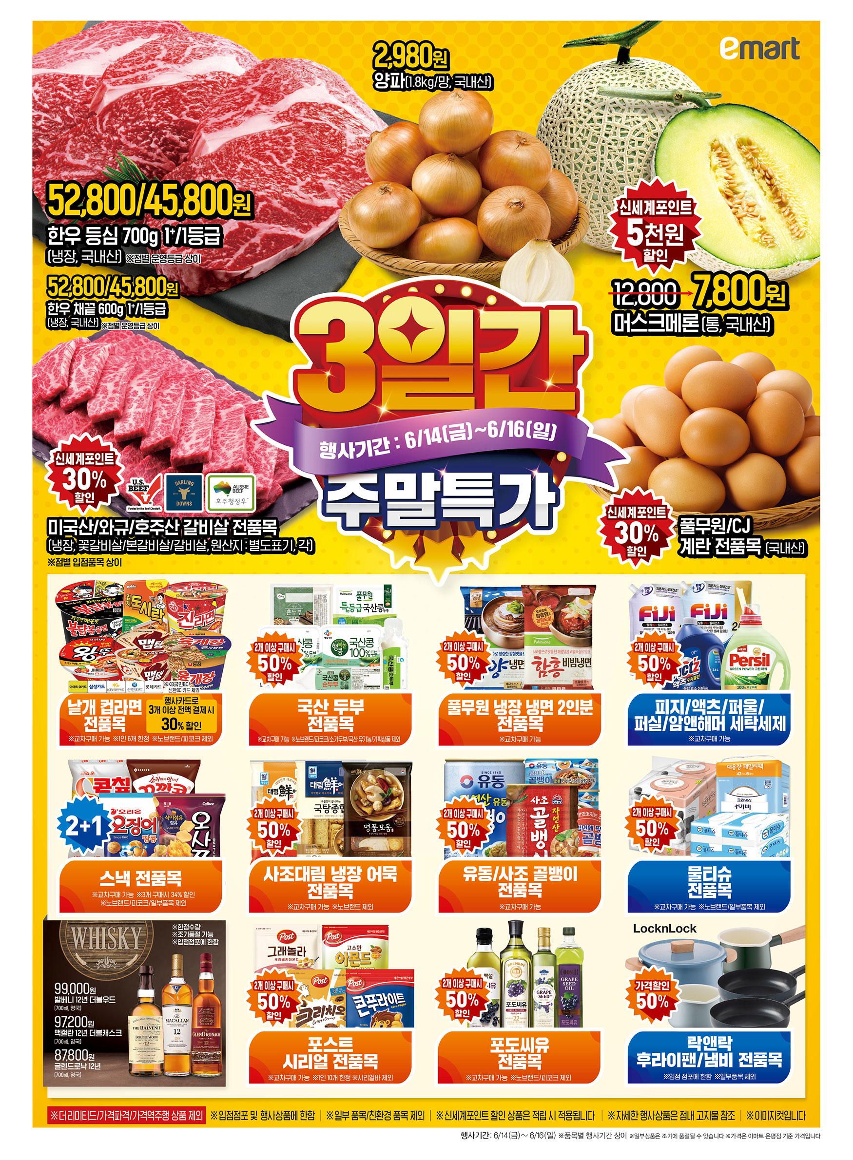 과일행사 이외에도 이마트에서는 지금 3일간 식품코너도 행사하고 있었는데요. 아래 전단지 사진을 보시면 식품 및 생활용품들도 있으니 살펴보세요!
