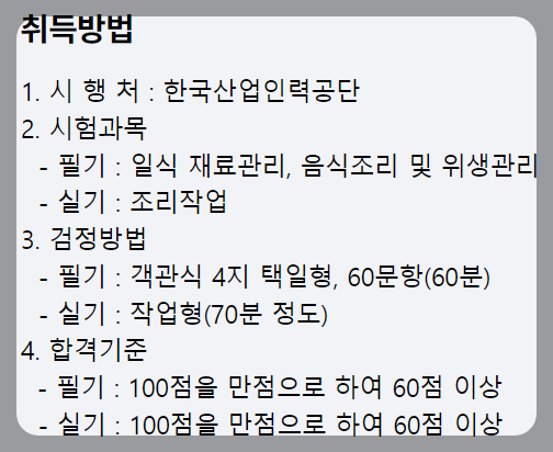 - 실기시험은 조리 과정과 위생 관리에 대한 세부적인 기준이 적용되므로 난이도가 높은 편입니다.