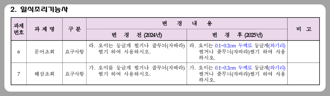 - 재료 손질 기준 변경: 오이·해산물 손질 시 두께 제한 추가 (예: 0.1~0.2cm 두께)