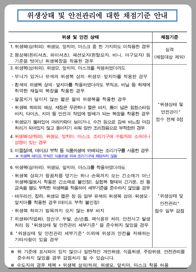 - 위생 관리 강화: 위생복·위생모·앞치마 미착용 시 실격