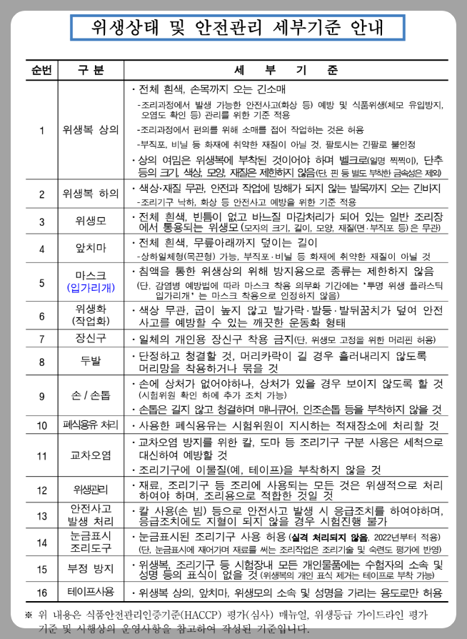 - 위생 관리 강화: 위생복·위생모·앞치마 미착용 시 실격