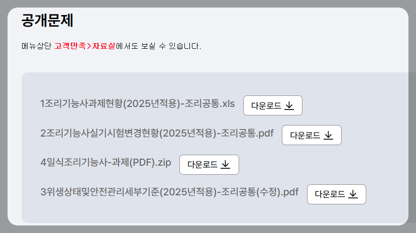 위의 공개문서 파일들은 큐넷에서 제공하는 일식조리사 과제 및 문제입니다. 2025년 최신정보로 반영된 위생상태 및 안전관리 세부기준에 대한 내용들도 있으니 꼭 확인해주세요!