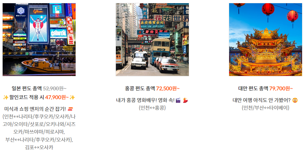 - 일본: 편도 47,900원부터 (할인코드 적용 시)