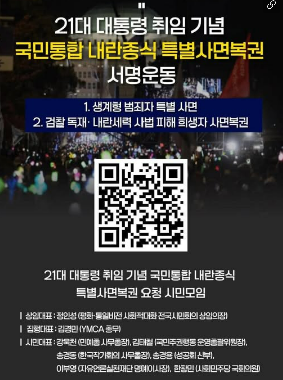 - 이에 따라 시민사회는 이재명 대통령에게 국민통합과 민주주의 회복을 위한 첫 조치로 ‘특별사면 복권’을 요청하고 있습니다.