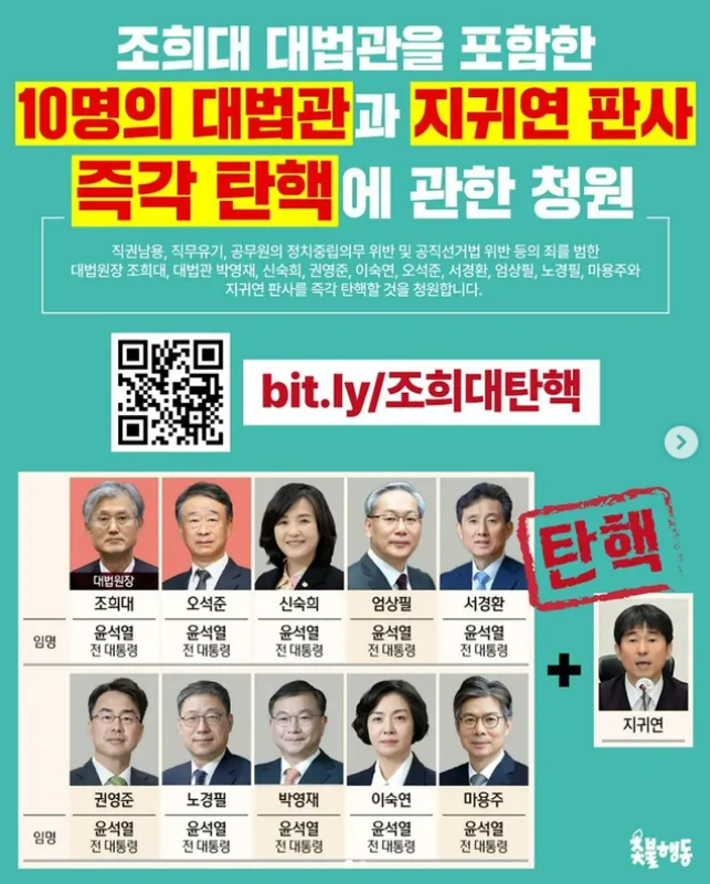 - 조희대 대법원장 포함 10명의 대법관 및 지귀연 판사 즉각 탄핵 및 직무배제 요청