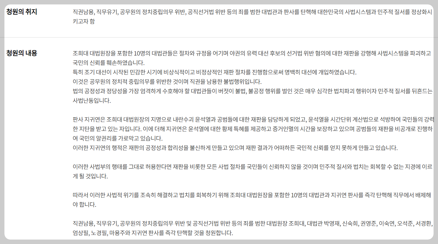 - 청원명: 조희대 대법원장 포함 10명 대법관 및 지귀연 판사 탄핵 청원