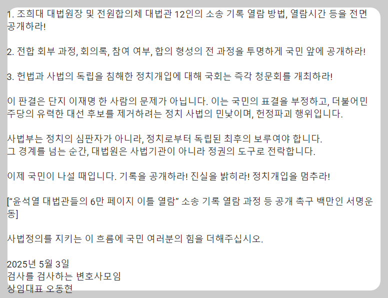 그 역할을 버리고 정치의 편에 선 순간, 대법원은 법원이 아닙니다. 지금 이 순간, 기록을 요구하는 당신의 목소리 하나가 역사를 바꿀 수 있습니다. 🖊 조희대 대법원장 100만 서명운동 청원에 지금 참여해 주세요.
