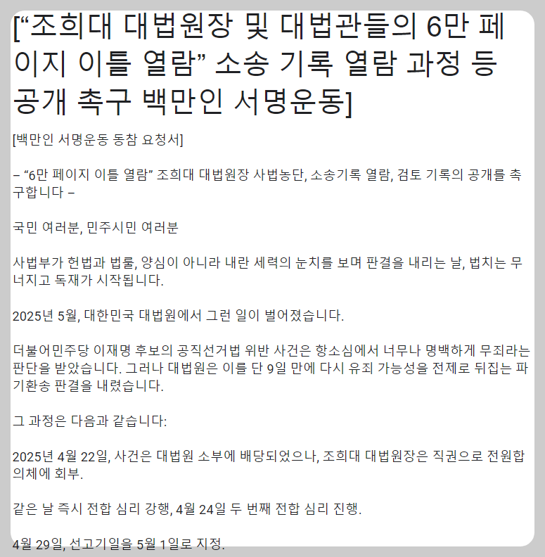 그 역할을 버리고 정치의 편에 선 순간, 대법원은 법원이 아닙니다. 지금 이 순간, 기록을 요구하는 당신의 목소리 하나가 역사를 바꿀 수 있습니다. 🖊 조희대 대법원장 100만 서명운동 청원에 지금 참여해 주세요.