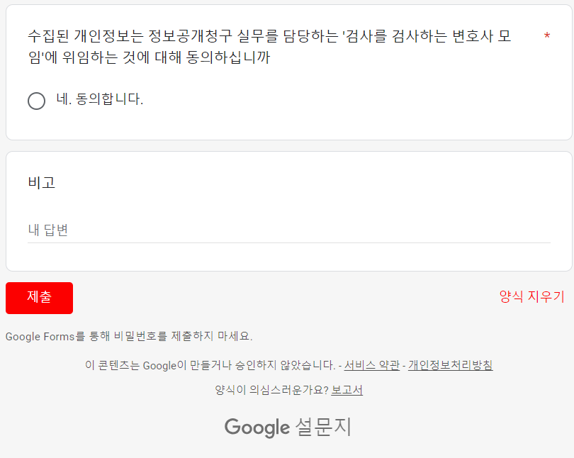 - '검사를 검사하는 변호사모임'에 위임하는 데 동의하셔야 제출이 가능합니다.