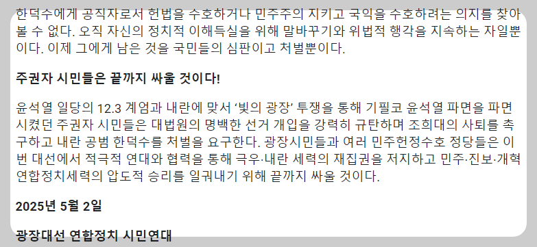 판결 직후, 한덕수 국무총리는 불과 1시간도 되지 않아 대선 출마를 선언했습니다. 이미 사전에 판결 결과를 인지하고 있었다는 의혹을 불러일으킬 수밖에 없는 대목입니다.