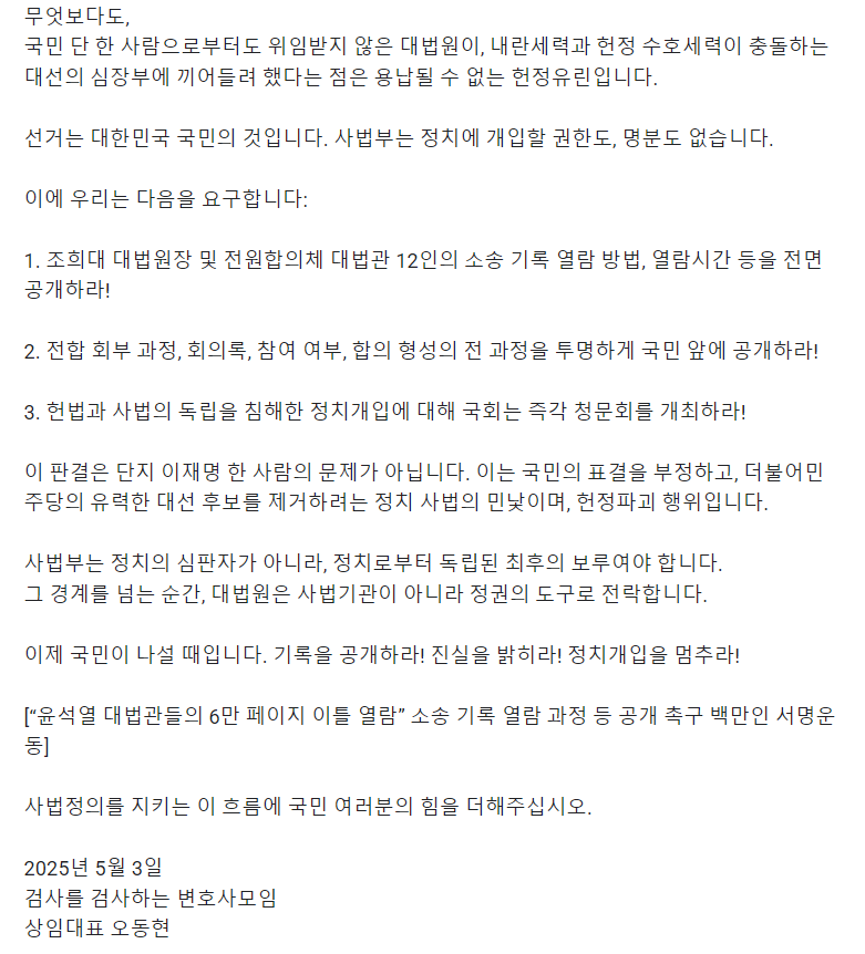 시민 연대와 정당, 지식인들이 결집한 이번 서명운동은 단순한 정치 투쟁이 아니라, 사법 정의와 민주주의 회복을 위한 싸움입니다.