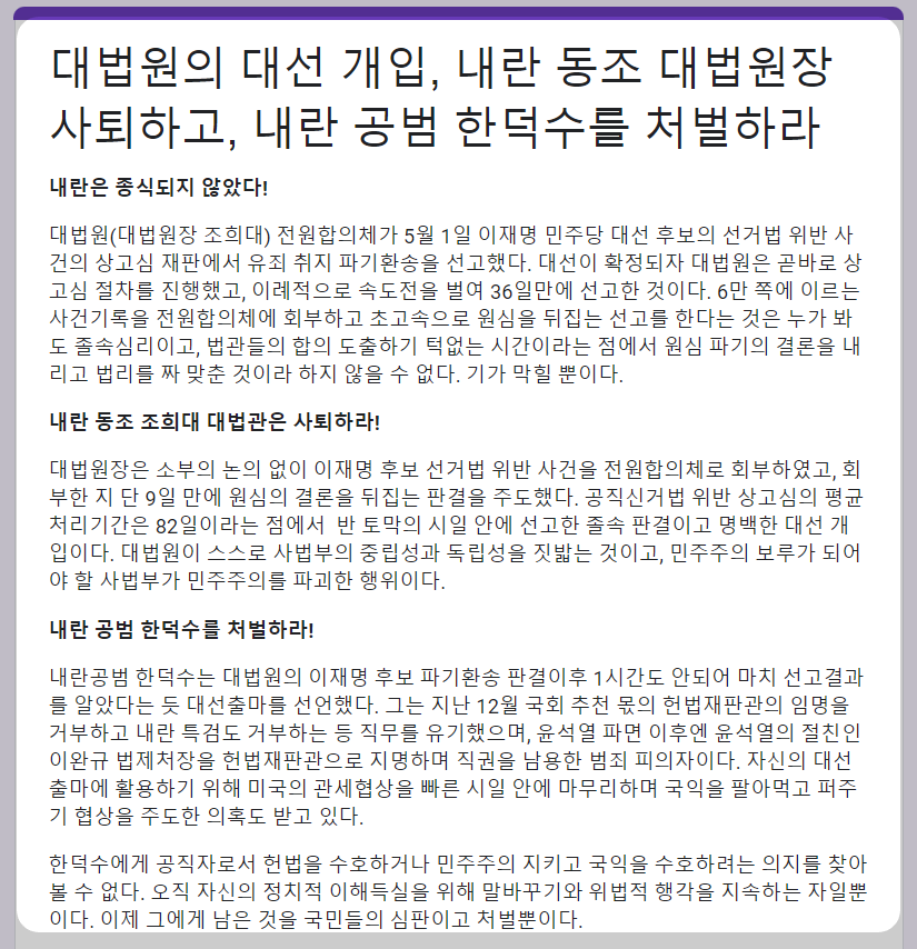 시민들은 이번 판결을 단순한 법률적 판결이 아닌, 대선에 직접 개입한 내란 동조 행위로 규정하며 조희대 대법원장의 즉각 사퇴를 촉구하고 있습니다. 📌조희대 로그기록 공개청원 및 한덕수 처벌 서명이 활발히 진행중입니다. 기간이 얼마 남지 않으니 서둘러 참여해주세요!