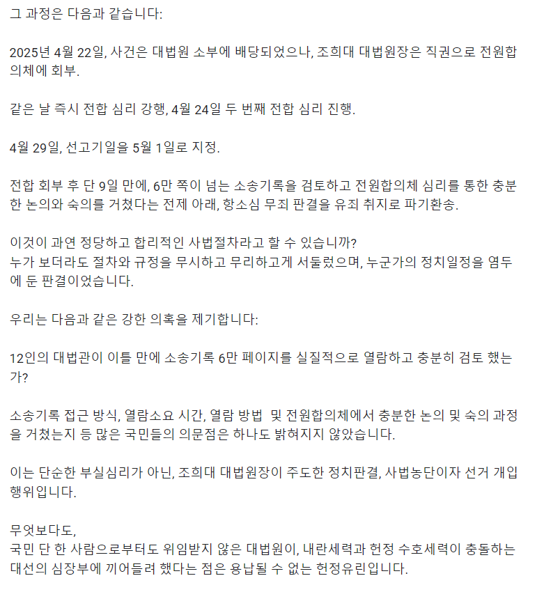 조희대 대법원장은 소부 논의 없이 전원합의체로 사건을 직권 회부했고, 단 9일 만에 원심을 뒤집는 판결을 주도했습니다. 공직선거법 상고심의 평균 처리 기간이 82일임을 고려하면 이례적 속도전이라 할 수 있습니다. 이같은 결정은 사법부가 민주주의의 수호자가 아니라 파괴자가 되었음을 여실히 보여줍니다.