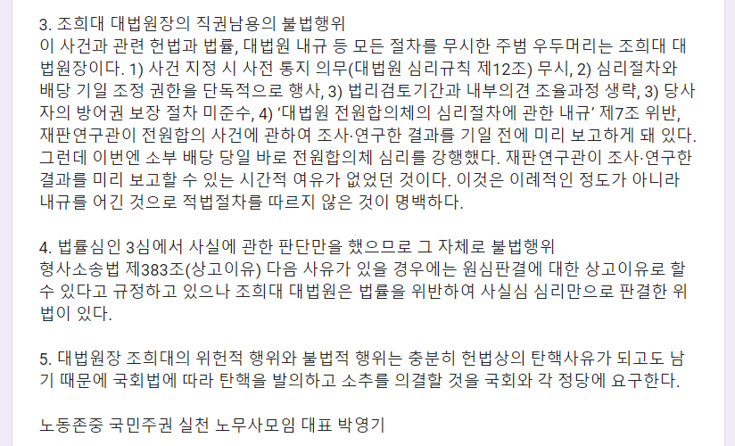 - 대법원은 헌법과 법률에 따라 양심에 따라 독립적으로 판결해야 함에도, 본 사건은 절차와 내용 모두에서 헌법적 원칙을 위반했다는 지적이 있습니다.