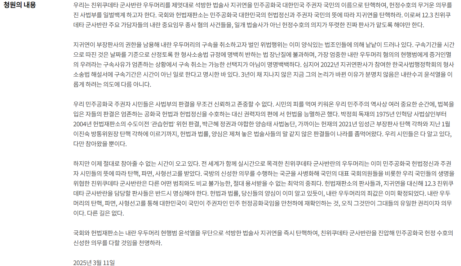 최근 지귀연 판사가 윤석열 전 대통령의 구속을 취소하는 판결을 내리며 논란이 확산되고 있습니다. 많은 국민이 이 판결을 헌정 질서를 위협하는 부당한 결정으로 보고 있으며, 이에 따라 국회 국민청원이 진행되고 있습니다. 국민의 힘으로 법 위의 권력이 존재하지 않는 사회를 만들어야 합니다.