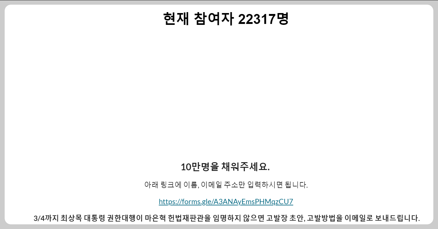 국민 한 명 한 명의 힘이 모이면 큰 변화를 이끌어낼 수 있습니다. 우리의 행동이 대한민국의 법치를 바로 세울 것입니다. 지금, 바로 동참해주세요!
