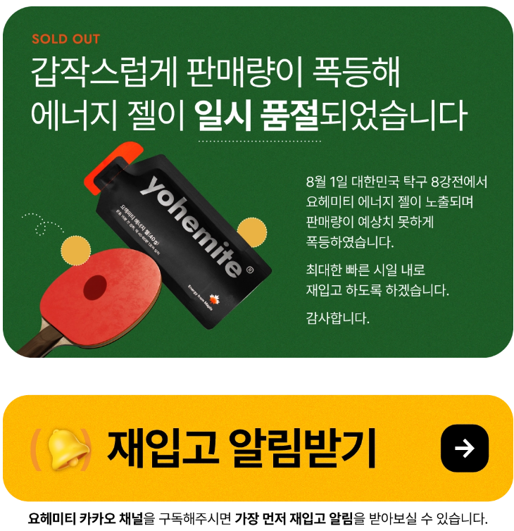 현재 요헤미티 에너지젤은 판매량이 폭등하여 일시 품절 상태입니다. 재입고 알림을 받고 싶다면, 요헤미티 카카오 채널을 구독하여 가장 먼저 재입고 알림을 받을 수 있습니다.